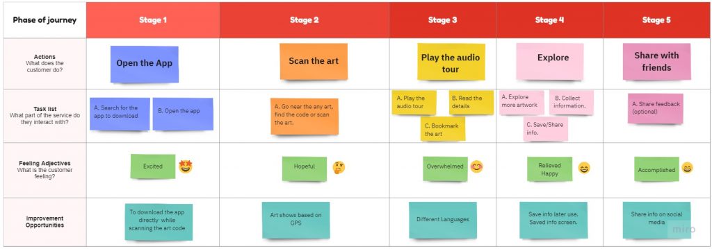 To empathise with the users, we also create empathy maps and user journey map to dig deeper into each stage that our personas go through while browsing the artwork.